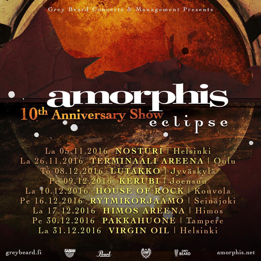 Kotimaisen metallin tunnetuimpiin yhtyeisiin lukeutuvan Amorphiksen vuonna 2006 julkaisema ”Eclipse” -niminen albumi täyttää tänä vuonna 10 vuotta. Yhtye on suunnistamassa albumin tiimoilta mittavalle juhlakiertueelle Suomessa ja voit katsoa tiedot yhtyeen tulevan juhlakiertueen keikoista tästä: