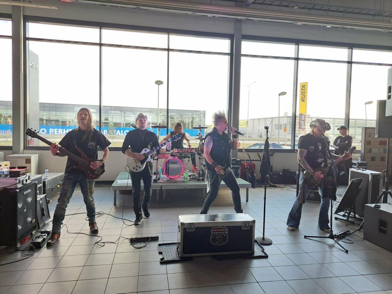 Saavuin keikkapaikalle noin vartti ennen ilmoitettua soittoaikaa ja ehdin siinä tsekata useammankin Kia – merkkisen auton. Samalla kiitin kohtaloa, että olin kerrankin keikalla selvänä liikenteessä, sillä joskus minulla on ollut taipumuksia hönössä ylilyönteihin heräteostosten kanssa. Väkeä oli kerääntynyt paikalle mukavasti ja varmasti lukema oli vahvasti kolmenumeroinen. Paikalla oli koko elämänkirjo ja tunnelma oli jännä yhdistelmä katujen henkeä ja virallisuutta, sillä paikalla olivat sulassa sovussa niin pieniä lapsia kuin moottoripyöräjengiläisiä. Tämä selvästi huomioitiin myös välispiikeissä, sillä mitään härskiyksiä ei kuultu. Niin sanottu lava oli pystytetty sisääntulokäytävän päätyyn, jossa oli tilaa sekä yleisölle että bändille.