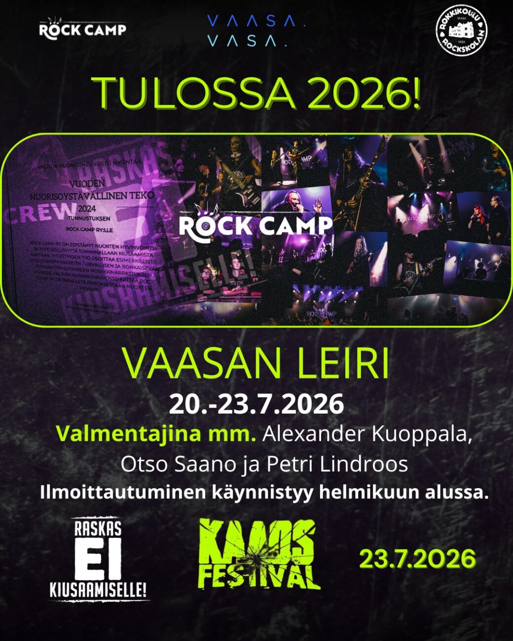 Ilmoittautuminen leirille avautuu helmikuun alussa 2026, jonka yhteydessä tullaan paljastamaan lisää tietoa myös tulevasta Raskas EI kiusaamiselle -konsertista. Paikkoja tulee olemaan rajoitetusti, joten osallistuminen kannattaa varmistaa ajoissa.